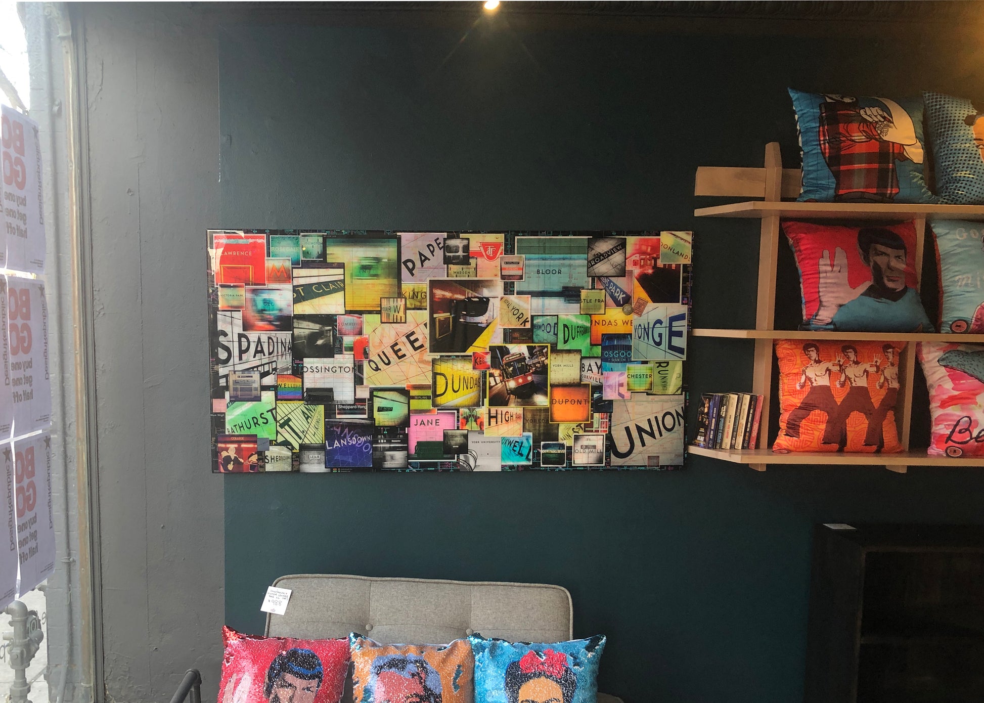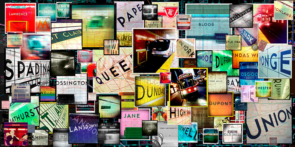 This balanced piece from the master of Toronto collages, is sure to be the focal point of any room. Equally at home in a casual living room, as it is in a formal dining room, you'll love having this piece of Torontonia in your space. It's got all of the Toronto subway stops, with a dark map in the background to help ground the collage.
